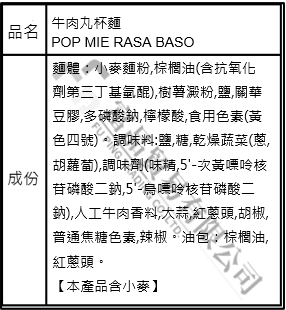 【商品特色】 印尼秒殺拌手禮!必吃POP MIE 牛肉丸杯麵(75g*24入/箱) 杯麵風味:雞肉湯杯麵/牛肉丸杯麵/洋蔥雞肉杯麵/咖哩雞肉杯麵/青檸雞肉湯杯麵 整箱購買 實惠便宜 即食杯麵 方便手拿 【商品規格】75g*24入/箱 【原產地】印尼 ● 本產品生產製程廠房,其設備或生產管線有處理花生,蝦,魚,蛋,堅果種子類,芝麻。 *本產品含有小麥,食物過敏者留意 *