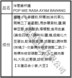 【商品特色】 印尼秒殺拌手禮!必吃POP MIE 洋蔥雞肉杯麵 (75g*24入/箱) 杯麵風味:雞肉湯杯麵/牛肉丸杯麵/洋蔥雞肉杯麵/咖哩雞肉杯麵/青檸雞肉湯杯麵 整箱購買 實惠便宜 即食杯麵 方便手拿 【商品規格】75g*24入/箱 【原產地】印尼 ● 本產品生產製程廠房,其設備或生產管線有處理花生,蝦,魚,蛋,堅果種子類,芝麻。 *本產品含有小麥,食物過敏者留意 *